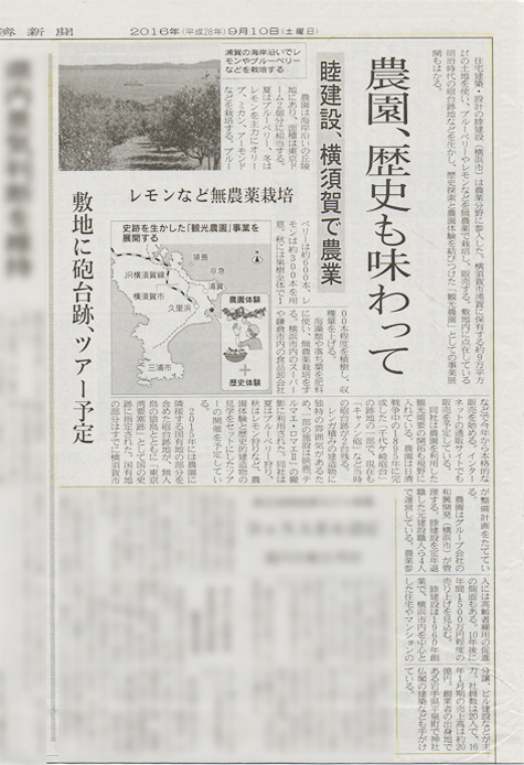 「住宅建築・設計の睦建設(横浜市)は農業分野に参入した。横須賀市浦賀に保有する約9万平方㍍の土地を使い、ブルーベリーやレモンなどを無農薬で栽培し、販売する。敷地内に点在している明治時代の砲台跡地などを生かし、歴史探索と農園体験を結びつけた「観光農園」としての事業展開もはかる。」